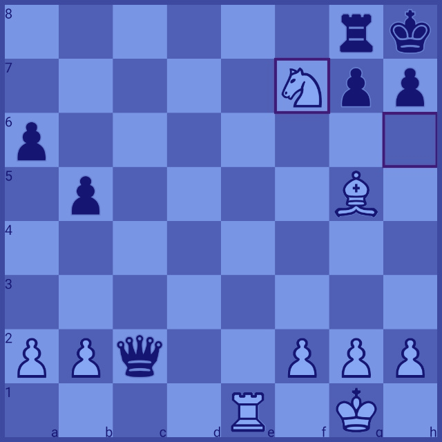 Rxe8 Rxe8 22. Nd6 Rf8 23. Re1 {a quiet move bringing the last piece into play} Qxc2 24. Qxe6+ Kh8 25. Nf7+ Kg8 26. Nh6+ Kh8 27.